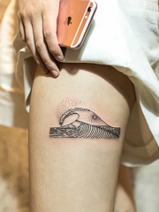 大腿海浪点刺线条纹身图案