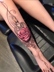 腿部绚丽玫瑰和逼真的钻石创意纹身图案