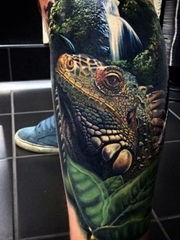 小腿上的逼真的写实风格丛林中的鬣蜥蜴纹身图片
