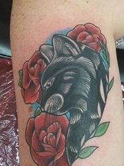 腿上漂亮的红色玫瑰花和黑色小猫纹身图片