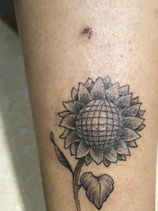 小腿处黑灰向日葵纹身图案