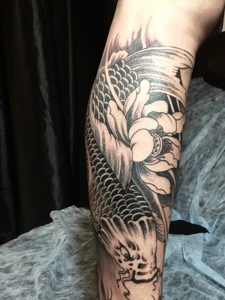 包小腿鲤鱼与莲花一起的纹身图案