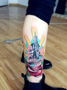 小腿处水彩灯塔纹身图案很个性