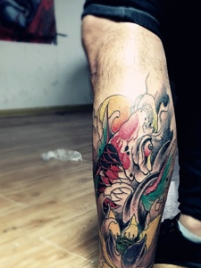 莲花与鲤鱼结合的腿部纹身图案