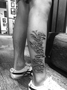 大花体英文腿部纹身图案很时尚