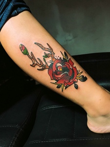 小腿处彩色玫瑰纹身图案很精美
