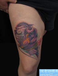 腿部纹身图片:腿部彩色猫头鹰纹身图片作品