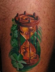 腿部纹身图片:腿部彩色沙漏四叶草纹身图片纹身作品