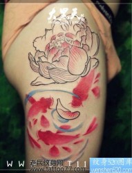 腿部水墨画风格的鲤鱼莲花纹身图片