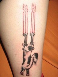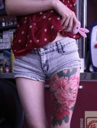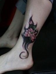 女孩子腿部水墨画风格彩色莲花纹身图片