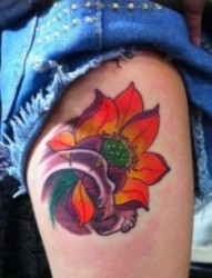 女孩子腿部彩色莲花纹身图片