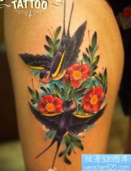 腿部一幅欧美风格小燕子樱花纹身图片