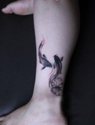 女人腿部精美的水墨画鲤鱼莲花纹身图片