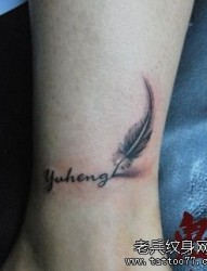 女孩子腿部字母与羽毛纹身图片