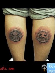 腿部超酷的石雕笑脸与哭脸纹身图片