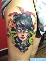 腿部超酷的一幅old school美杜莎纹身图片