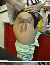 美女大腿经典的黑灰蝴蝶结纹身图片