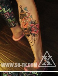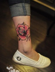 女人腿部唯美潮流的new school玫瑰花纹身图片