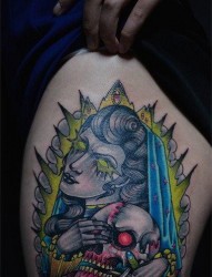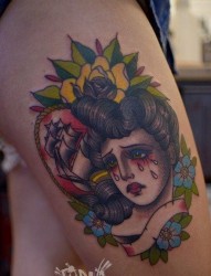 女人腿部经典的一幅哭笑的樱桃纹身图片