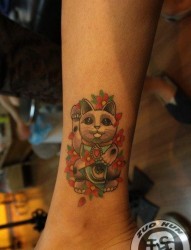 女人腿部时尚潮流的招财猫与上帝之眼纹身图片