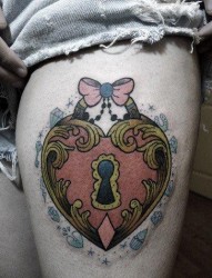 女人腿部精美潮流的彩色爱心锁纹身图片