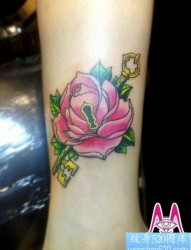 女人腿部唯美潮流的玫瑰锁与钥匙纹身图片