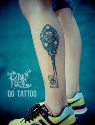 腿部潮流时尚的黑白钥匙纹身图片