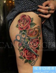 女人腿部很酷时尚的玫瑰剪刀锁纹身图片