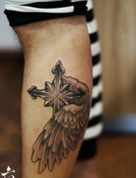 腿部潮流时尚的一幅十字架翅膀纹身图片