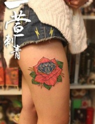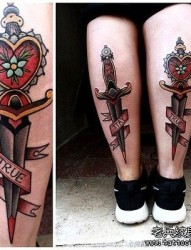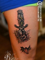 腿部漂亮时尚的匕首玫瑰纹身图片