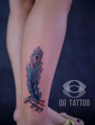女人腿部唯美好看的彩色羽毛与字母纹身图片