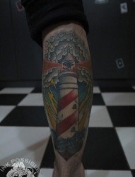 腿部潮流时尚的一幅灯塔纹身图片