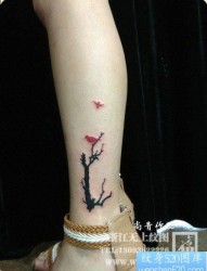 女人腿部时尚潮流的图腾小树与小鸟纹身图片