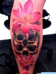 小腿上一幅个性的骷髅莲花纹身图片