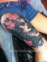 大腿上一幅潮流欧美人物纹身图片