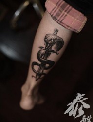 腿部黑色蛇缠刀纹身图片