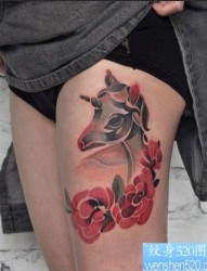 一幅腿部独角兽玫瑰花纹身图片由纹身520图库推荐