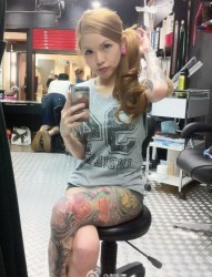 火辣性感的美女刺青师Kinki Ryusaki的腿上刺青秀
