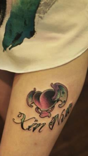 美女腿部小巧潮流的爱心翅膀纹身图案