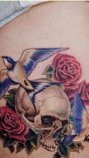腿部个性时尚好看的骷髅玫瑰花纹身图