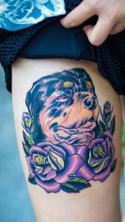 女性腿部时尚好看的汪星人玫瑰花纹身