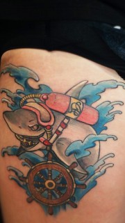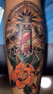 时尚女性腿部好看的彩色帆船玫瑰花纹身