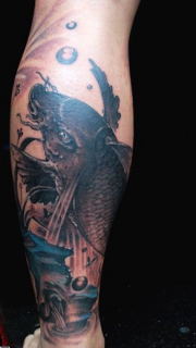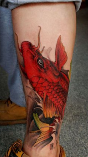 腿部赤红褐色美丽帅气龙鱼纹身图案