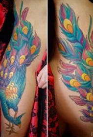 孔雀毛纹身 女生腿部彩色的孔雀纹身图片
