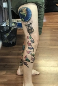 纹身腿部 男生腿部旗帜和热气球纹身图片