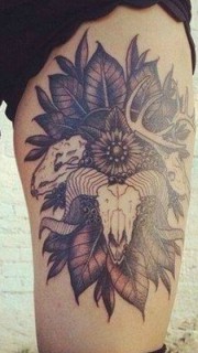 女性腿部羊头骨纹身图案