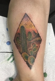 男生小腿上彩绘几何菱形和植物仙人掌纹身图片