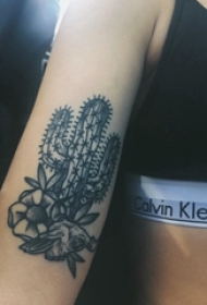 女生手臂上黑灰素描点刺技巧创意文艺仙人掌纹身图片