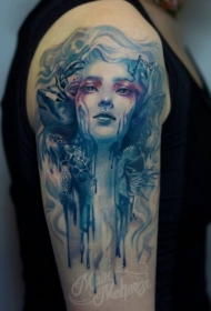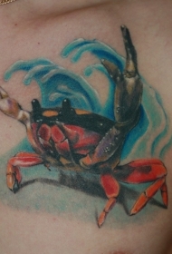 胸部彩绘螃蟹和蓝色浪花纹身图案