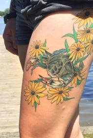 大腿插画风格彩色花朵和螃蟹纹身图案